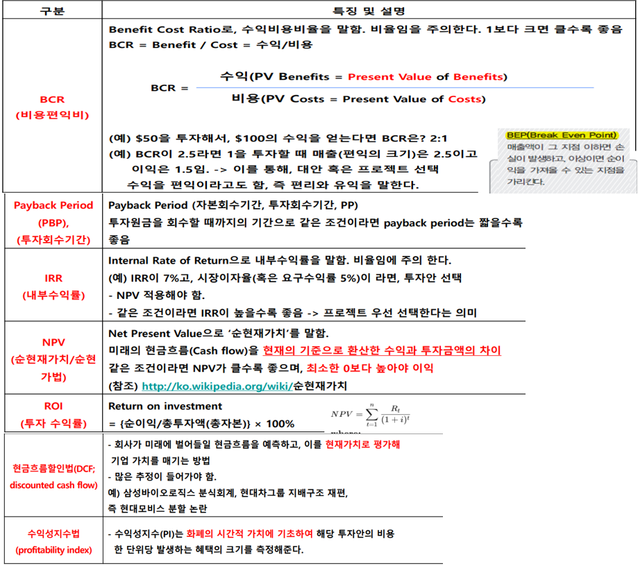 - 사업 타당성, 경제성 분석결과 문서, 투자타당성을 판단 하기 위한 재무적 지표