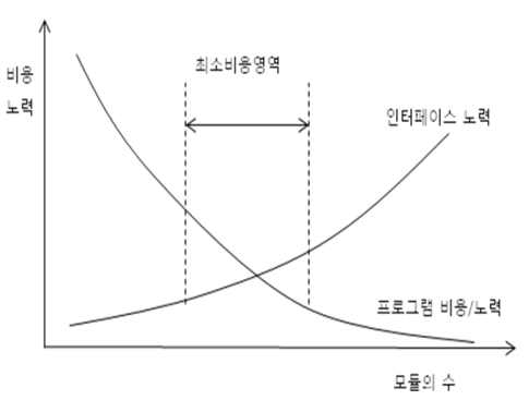 - 모듈의 수가 증가 할수록 모듈 당 비용은 감소 하지만 인터페이스 비용은 증가하게 되므로 적정 수준의 모듈 개수 유지