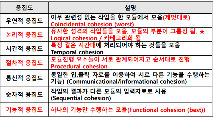 - 소프트웨어 응집도 단계 우논시절통순기 (응집도는 높을수록 좋음)