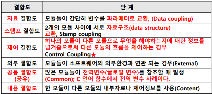 - 결합도 단계 내공외제스자 (결합도는 낮을수록 좋음)