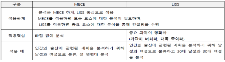- LISS( Linearly Independent Spanning Set ) - 중복 없이 각각의 부분 집합(문제)에서 대표 부분집합(문제)의 핵심 의미를 명확히 파악하는 전략적 사고 방법