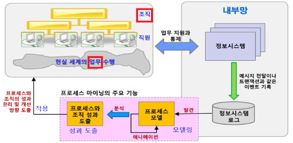 - 업무 프로세스 분석을 위해 관련된 정보시스템(ERP, BPM, BPR, SCM등) 로그를 분석해 조직 프로세스 성과, 지식 도출, 개선 목적의 활동 및 방법론