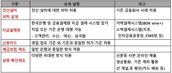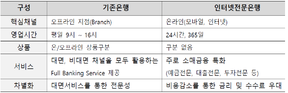 - 비대면 전자금융거래의 방법으로 수신 및 여신 등 기존 은행 업무를 수행하는 은행