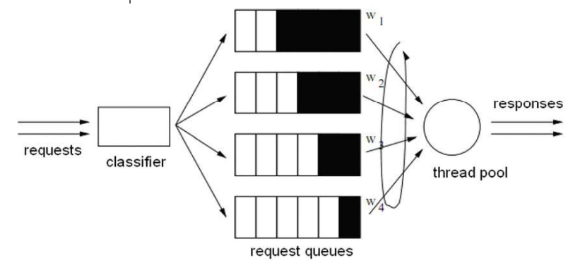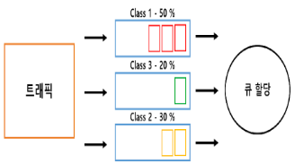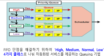 - Priority Queue - 클래스별 우선순위 지정 - 4개의 클래스로 분류 - FIFO 단점 해결 - 장점 : 차등 트래픽 서비스 가능 - 단점 : 낮은 우선순위 트래픽 기아현상 발생 가능 |