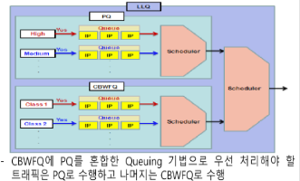 - Class Based Queue - PQ 변형(등급별 큐) - Starvation(기아상태) 방지 - 특정 클래스 트래픽 지연, 대역폭 독점 방지 |