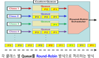 - Custom Queue - 클래스별 Round-Robin - 16개 클래스로 분류 - PQ 단점을 해결 - 장점 : 클래스 별 공평한 서비스 - 단점 : 차등 트래픽 서비스 불가 |