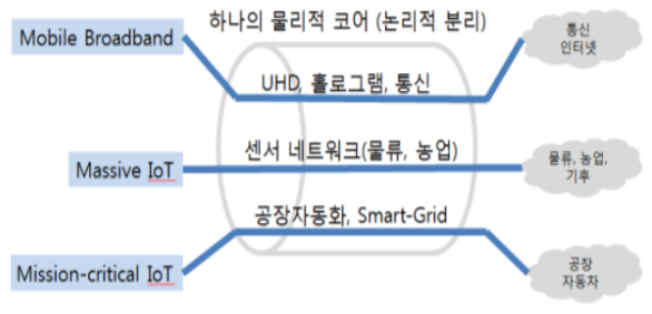 - 다양한 서비스 특화 네트워크를 위해 물리적 네트워크를 Device, Access, Transport, Core를 포함하여 End-to-End로 논리적 분리 네트워크 구성하는 서비스 특화된 전용 네트워크 기술