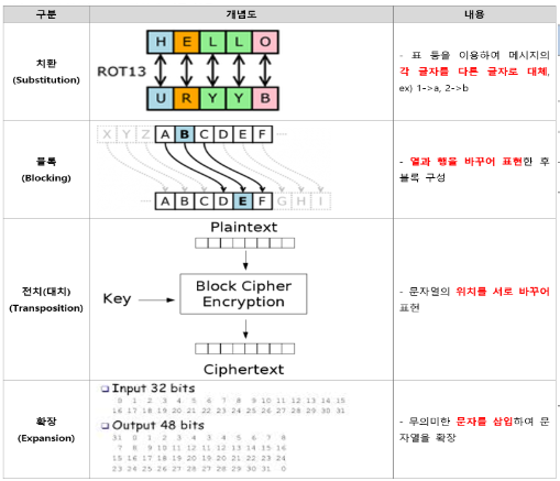- 메시지의 내용이 불명확하도록 평문(Plain text)을 알고리즘과 암호화를 위한 키에 따라, 재구성하여 암호화된 문장(Cipher text)으로 만드는 과정(Cipher; 암호)