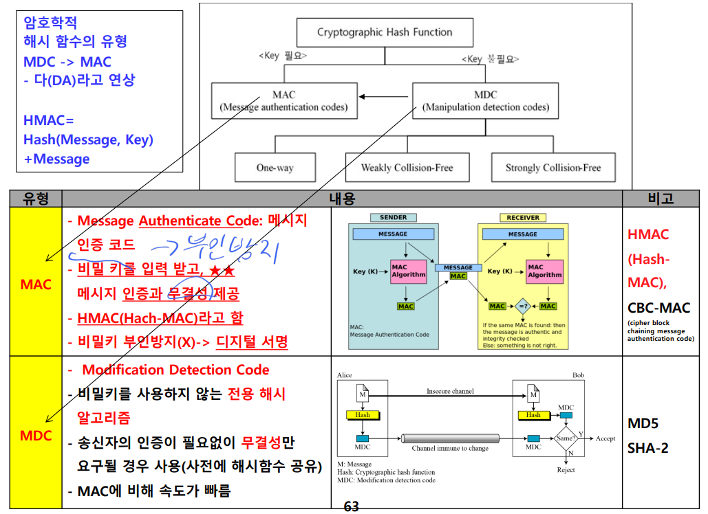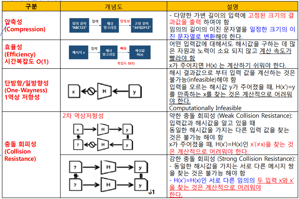 - 출력 값을 해시 값 (hash value) 혹은 메시지 다이제스트 (message digest) 라고도 함