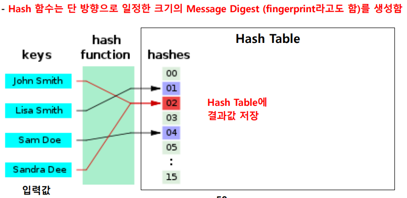 - 목적 ) 해시함수을 사용하면 같은 해시 값을 갖는 두 개의 다른 입력 메시지를 찾아내기란 불가능하므로 하나 의 해시 값을 가지고 원래의 입력된 메시지를 예측할 수가 없게 됨(이 과정을 Hashing 이라고함)