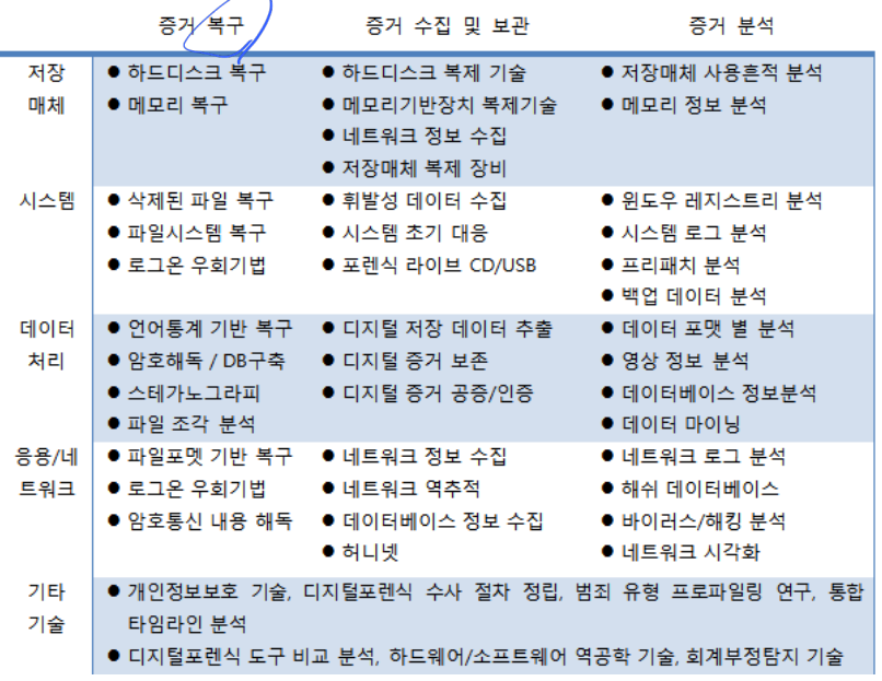 - 정보 추출 포렌식 : 법적 입증, 증거물 수집
