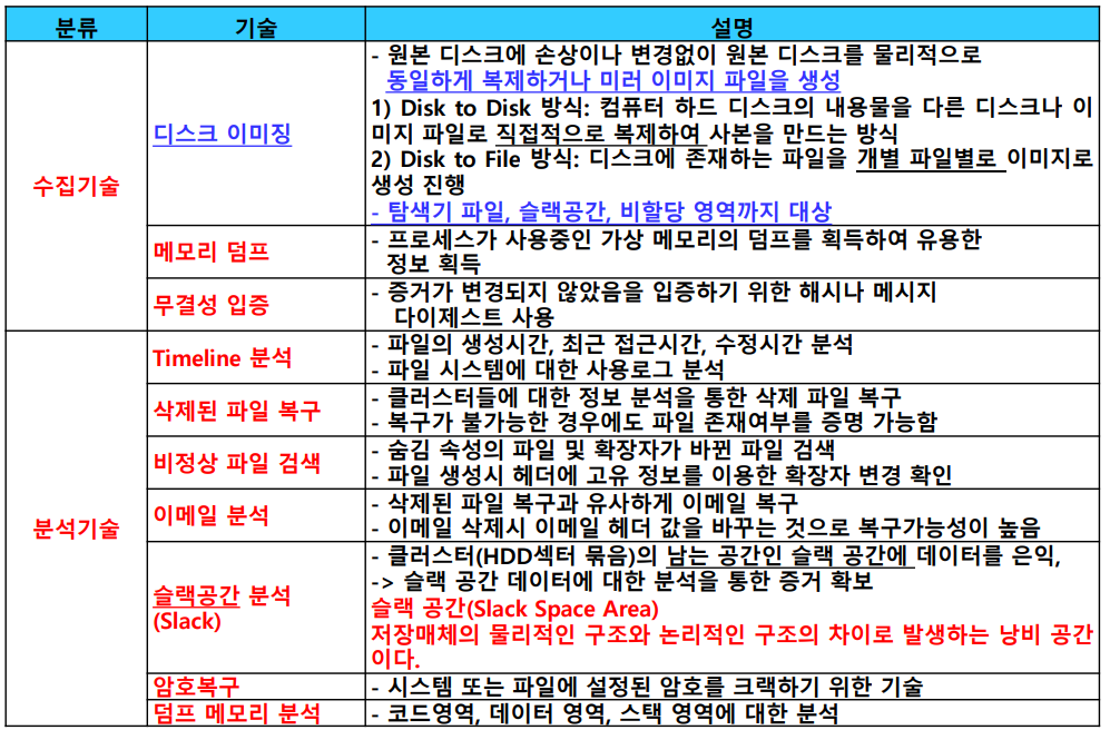 - 정보시스템 통한 범죄 행위에 대한 법적 증거 자료 확보를 위한 시스템, 네트워크 등 가상 공간의 자료를 법적 증거로 확보, 제출하는 일련의 방법