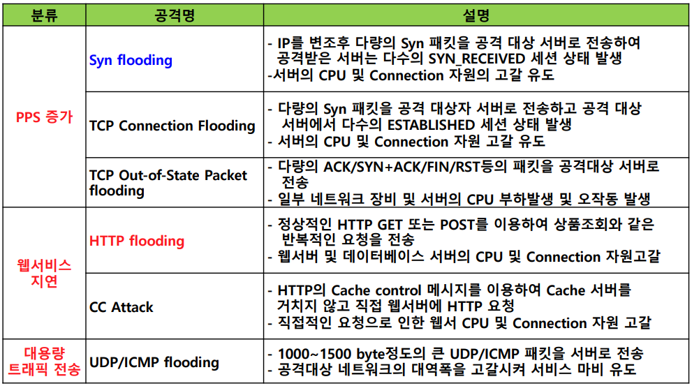 - 대량의 데이터 전송 또는 패킷 지연등을 통한 서비스 지연, 자원소모 유발하는 서비스 거부 공격
