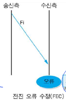 - 송신측이 전송할 문자나 프레임에 부가정보(Redundancy)를 추가 전송 후 수신측 에러 발견 시, 부가정보로 에러 검출 및 정정 수행하는 오류제어기법