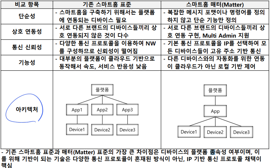 - 스마트홈 기기들의 제조사 의존적인 한계를 극복하기 위해 만든, 모든디바이스 호환이 가능한 인터넷 프로토콜(IP) 기반 스마트홈 연동 표준