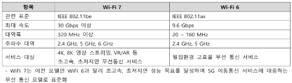 - Wi-Fi 6 보다 3배 빠르고 초 실감 미디어 컨텐츠를 안정적으로 전송하는 차세대 무선통신 기술