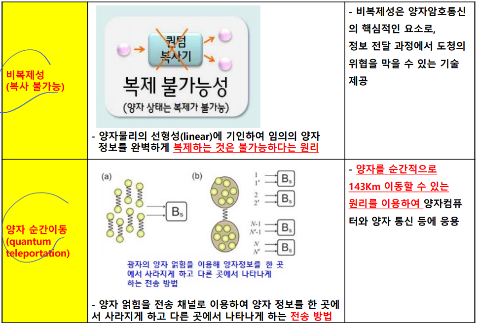 - 양자 중첩, 얽힘, 불확정성, 비복제성 등의 다양한 물리현상을 이용한 암호 제공으로 안전성 극대화한 암호기법