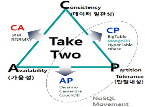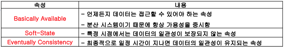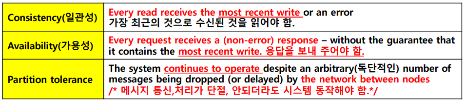 - CAP 이론에 따르면 분산 데이터베이스 시 스템은 네트워크 파티션이 발생하였을 때 세 가지 속성 중 두 가지만 만족할 수 있다