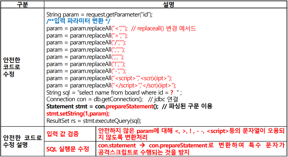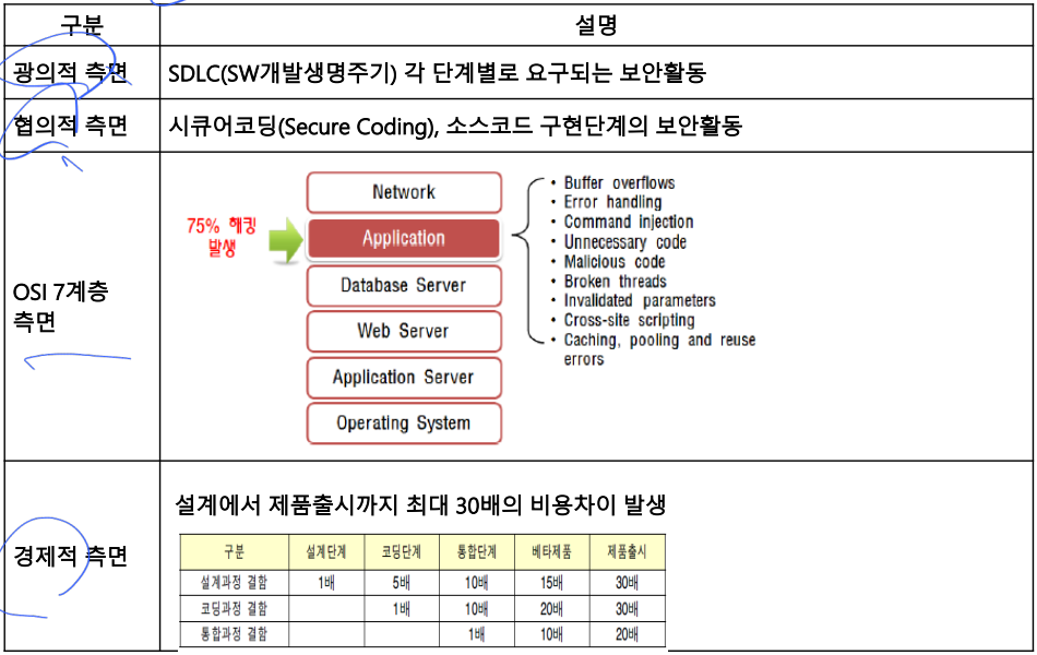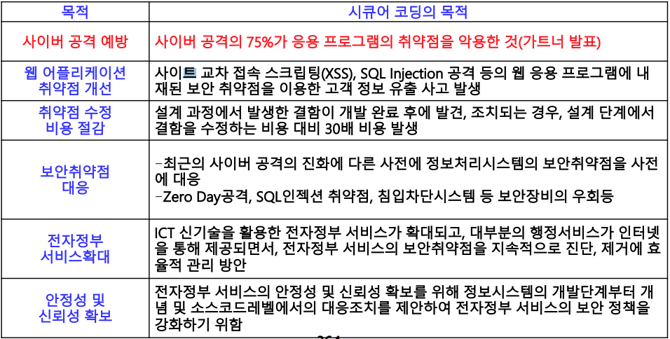 - 서비스의 안정성과 신뢰성 확보를 위해 IT 시스템 개발 단계에서 주요 보안 취약점을 고려하여 소스코드 레벨에서 사전에 제거하여 안전한 소프트웨어를 개발하는 기법