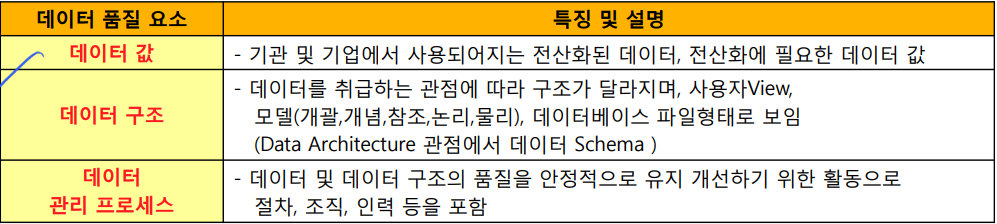 - 데이터 품질기준수립 : DQI, CTQ 선정 : 데이터 품질 기준정보