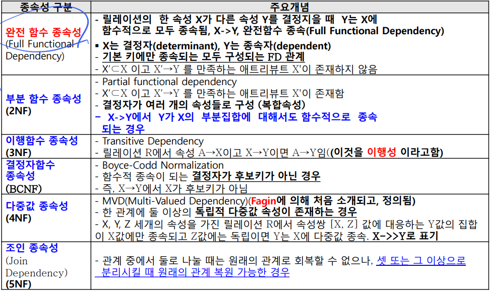 - 릴레이션 속성의 부분집합 X,Y에 대해 모든 튜플의 X값에 대한 Y값이 항상 하나인 성질