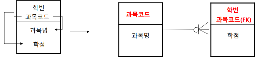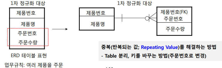 가. 1차 정규화 - 반복(중복) 제거 -> 의존자의 중복을 없애는 작업
