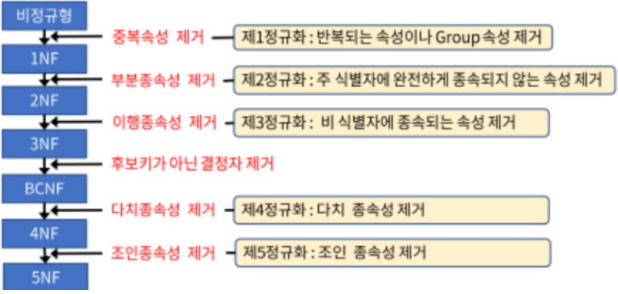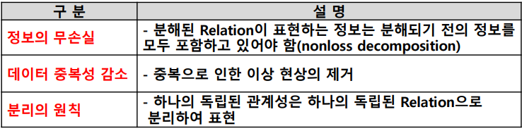 - 이상현상을 발생시키는 Attribute 간의 종속 관계(FD)를 제거하기 위하여 Relation(테이블)을 작은 여러 Relation(테이블)으로 무손실 분해하는 과정