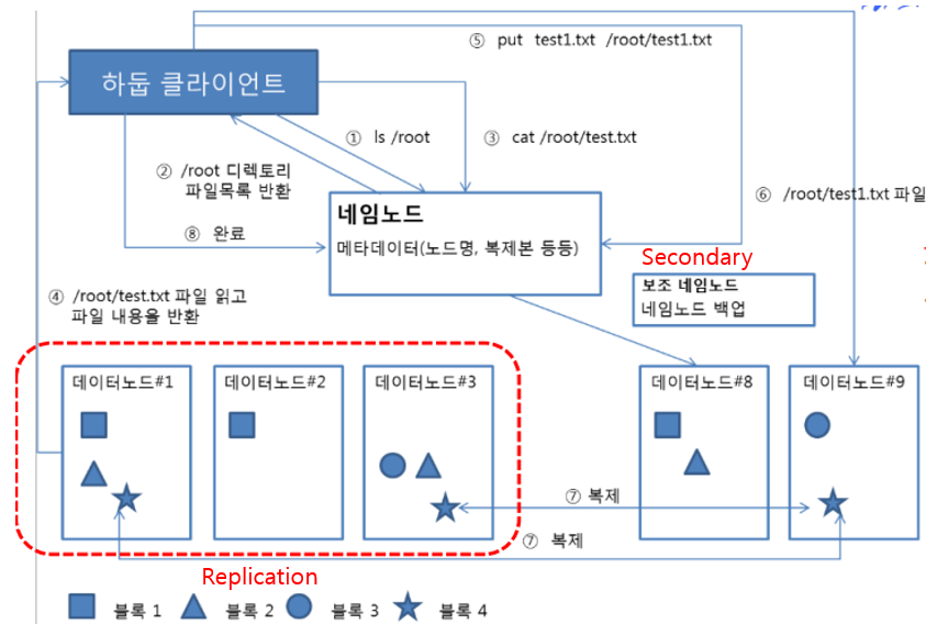 - 데이터노드의 블록은 모두 3개 이상의 복제본이 각 노드에 복사 및 저장되며, 만약 파일에 문제가 발생하면 즉시 복제본으로 대체돼 서비스가 중단되지 않는 이점이 있다