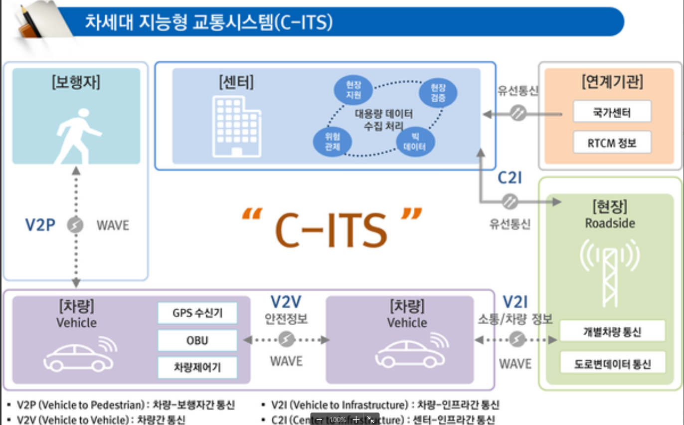 - 차량과 차량(V2V) 차량과 인프라(V2I) 간 양방향 통신으로 교통정보를 교환 및 공유하여 서비스를 제공하는 차세대 ITS