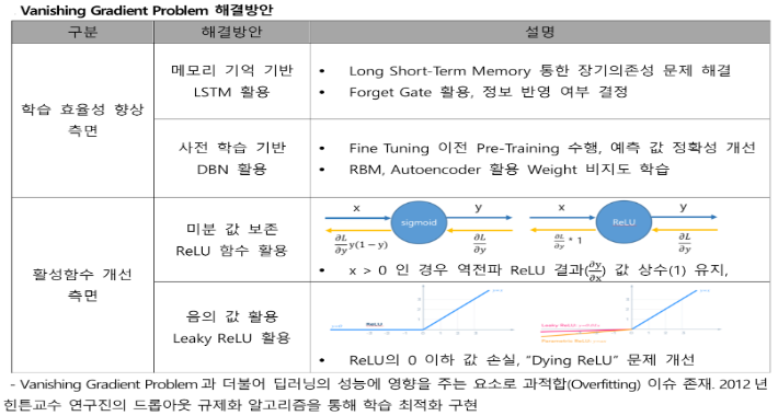 - Layer(층) 깊이 측면 : 복잡한 문제 해결 위한 층 확장 국부해(Local Minimum) 수렴, 최적해 수렴 시 반복 계산 증가