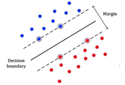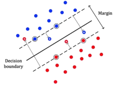 - 데이터가 사상 된 공간에서 여백(Margin)을 최대화하고 일반화 능력을 극대화하여 결정 직선을 찾는 두 범주를 갖는 객체들을 분류(이진 분류, Binary classification) 하는 알고리즘
