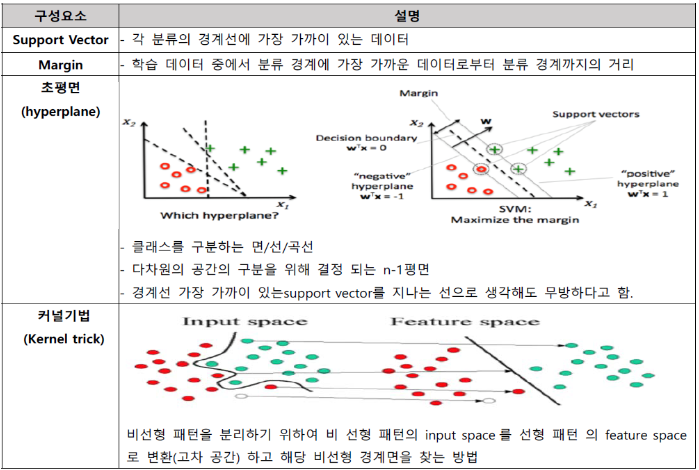 - 데이터 사상공간 경계선과 최근접 데이터(Support Vector)간 최대거리 경계 식별 알고리즘(MMH :Miximum Margin Hyperplane, 초평면)