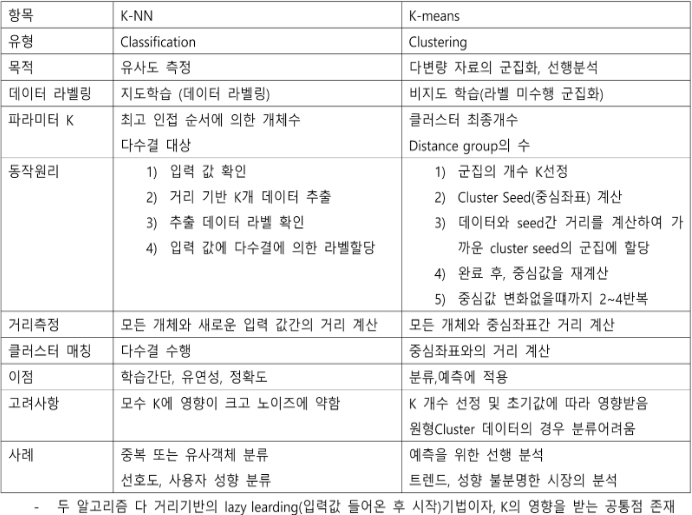 나. K-최 근접 알고리즘(K-Nearest Neighbor) , K-평균 알고리즘(K-means) 비교