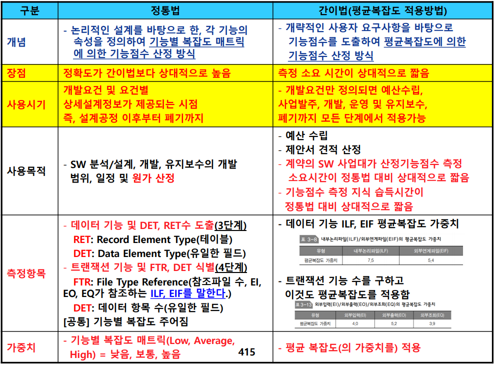 - 소프트웨어 크기를 결정하는 소프트웨어 기능 유형별 수량과 성능 및 품질요인들의 영향도를 고려하여 계산되는 SW규모 산정 방식