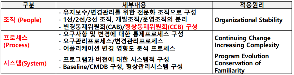 - 소프트웨어 변화의 특성 이해를 통한 유지보수, 변경관리, 형상관리, 품질통제의 중요 모델 반영