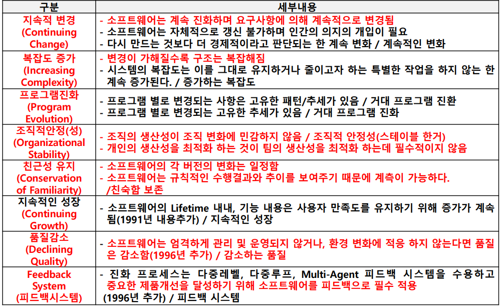 - 소프트웨어는 요구에 의해 계속 변경되며, 변경에 따른 복잡성, 고유 변경 추세, 생산 일관성, 각 버전의 변화에 대하여 일관성을 제시한 sw변화 원리