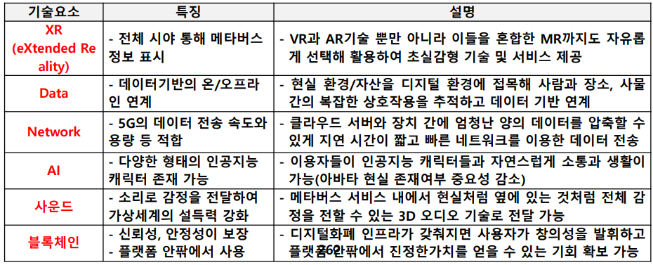| 3대 지향가치 | - 메타버스와 관계를 맺는 개인적, 사회적, 시간적 영역에서 추구해야하는 ‘온전한 자아, 안전한 향유, 지속적 번영’ 제시 |