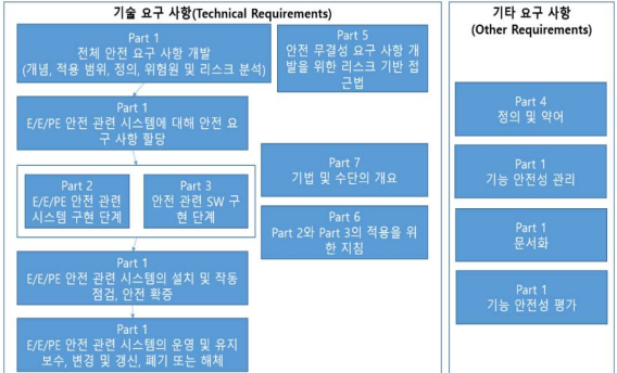- 전기,전자,프로그램 가능한 시스템의 기능안전 표준으로 안전생명주기, HW, SW 안전성 구현 및 검증 방법 제시 표준