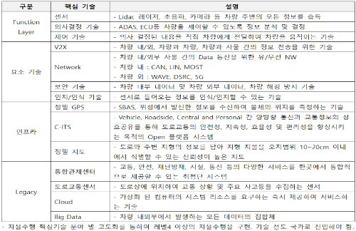 - 자동차 스스로 주변환경을 인식하여 위험을 판단·주행 경로를 계획하는 등 운전자 주행조작을 최소화하며 스스로 안전주행이 가능한 자동차