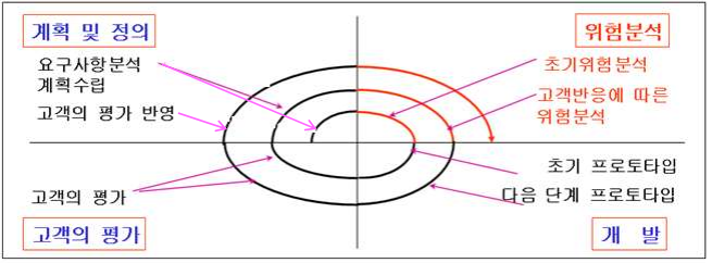 - 시스템 개발 중 생기는 위험을 최소화하기 위해 나선을 돌면서 점진적으로 개발하는 모델 폭포수 모델 + 프로타입 모델 + 위험 분석