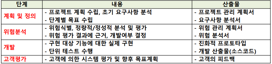 - 위험 최소화, 대규모 프로젝트 사용, 반복적