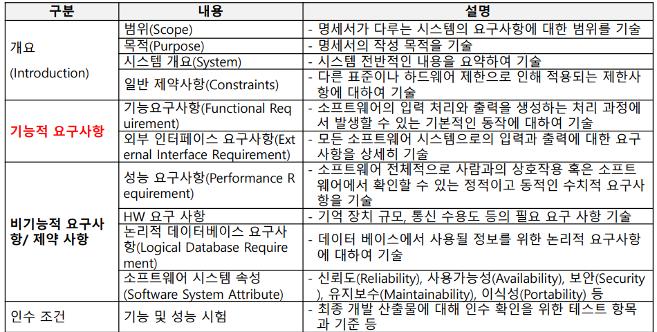 - SW가 갖추어야 할 요건, 능력, 기능등을 기술한 평가, 승인의 기준이 되는 문서