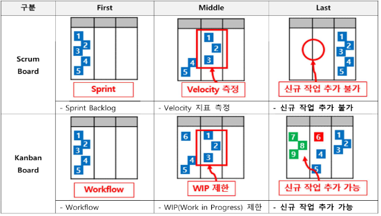 - 칸반은 공정의 지속적으로 인입하고, 완료되면, 다음 공정으로 Shift 하여 이동함