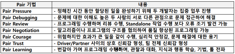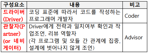- 2명의 개발자가 프로그램의 설계, 알고리즘, 코딩, 테스트 등을 함께 작성