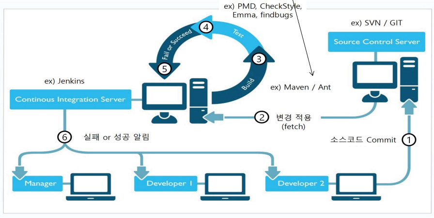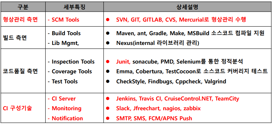 - [CI의 정의] 자동화 도구를 이용해 개발자별 소스코드를 지속적으로 빌드, 테스트, 배포 할 수 있는 환경(형상관리 필수적용)