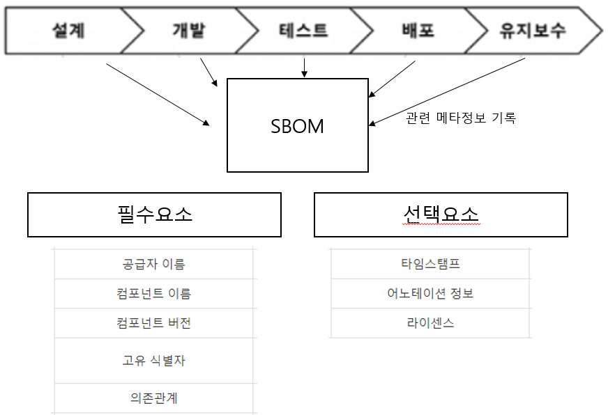 1. 소프트웨어 자재명세서 SBOM의 개념 환경 파악 및 의사결정을 빠르게 하기 위해 소프트웨어의 구성에 사용된 컴포넌트 관련 메타정보를 기록한 목록표 소프트웨어 패키지 및 구성 요소 등 고유하게 식별 가능한 메타데이터, 저작권 및 라이선스 등 소프트웨어 콘텐츠에 대한 정보를 포함하는 공식 명세서 2. 소프트웨어 자재명세서 SBOM 구성도 및 구성요소 가. SBOM 구성도 나. SBOM 구성요소 - 필선 공이버식의 타어라 구분 구성요소 설명 필수요소 공급자 이름 - 구성요소를 만들고 정의하고 식별하는 주체의 이름 컴포넌트 이름 - 최초 공급자에 의해 정의된 소프트웨어 단위의 명칭 컴포넌트 버전 - 이전 소프트웨어 버전의 변경을 명시하기 위한 식별자 고유 식별자 - 구성요소 식별 및 데이터베이스 조회 키 ..