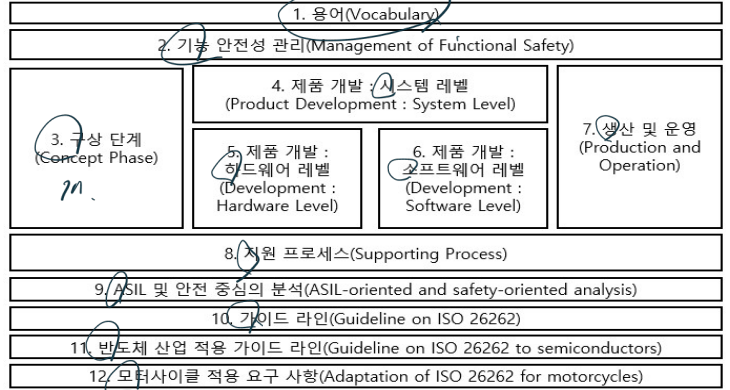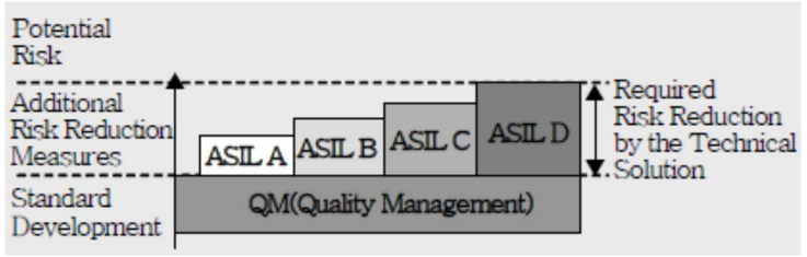 1. 정의 전기전자 장치안전 표준(IEC 61508)의 안전성 보전등급(SIL)을 자동차에 맞게 개선 적용한 차량 안전성 등급 SIL레벨을 자동차환경에 맞춰 적용, 심각도(S),노출가능성(E),제어가능성( C) 2. 안전성 등급 구성도 및 등급 결정 요소 위험도에 따라 A~D 단계로 분류함 가. 구성도 나. 등급 결정 요소 - S( 3심가위생불 ) E( 4거매낮중높 ) C( 3일간정어 ) S(Severity) : 위험의 잠재적 심각도(Potential severity), S0 ~ S3 E(Exposure) : 재난상황에 노출 가능성(Probability of exposure), E0 ~ E4 C(Controllability) : - 통제가능성(Controllability), C0 ~ C3