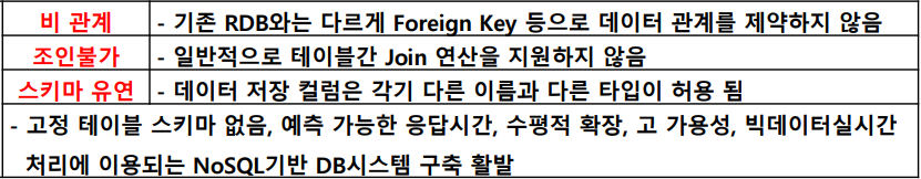 1. 정의 분산 환경에서 단순 검색 및 Data 추가 작업 시 처리 효율과 빠른 응답 속도를 위한 Key/Value 기반의 DBMS 2. NoSql 특징 - 개기 비조스 대저병필 가. 개념적 특징 나. 기술적 특징 3. NoSQL DB 이론 및 속성 가. 속성 - BASE 나. CAP 이론 - 일가단 - CAP 이론에 따르면 분산 데이터베이스 시 스템은 네트워크 파티션이 발생하였을 때 세 가지 속성 중 두 가지만 만족할 수 있다 다. 품질속성 PACELC - CAP 이론 단점 보완 위해 네트워크 장애 상황과 정상 상황으로 나누어서 설명하는 이론 4. 모델링 절차 및 유형 가. 모델링 절차 - 파리모기선적하 나. DB 유형 - 키컬도그