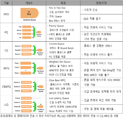 1. 정의 Qos(Quality of Service) : 한정된 네트워크 자원에서 선택된 네트워크 트래픽 또는 어플리케이션에 대해 차별화 된 서비스를 제공하는 네트워크 기술 네트워크 장비가 처리 할 수 있는 능력 이상으로 트래픽이 발생 할 때 패킷들을 Queue 에 저장해 두었다가 스케줄링 정책에 따라 트래픽을 처리하는 스케줄링 기법 2. Queue 관리 기술 기술 개념도 특징 FIFO - First in First Out - 인입 순서대로 처리 - Best Effort 방식 - 단독 Queue - 장점 : 구조 단순 - 단점 : Qos 적용 불가 PQ - Priority Queue - 클래스별 우선순위 지정 - 4개의 클래스로 분류 - FIFO 단점 해결 - 장점 : 차등 트래픽 서비스 가능 - 단점 ..