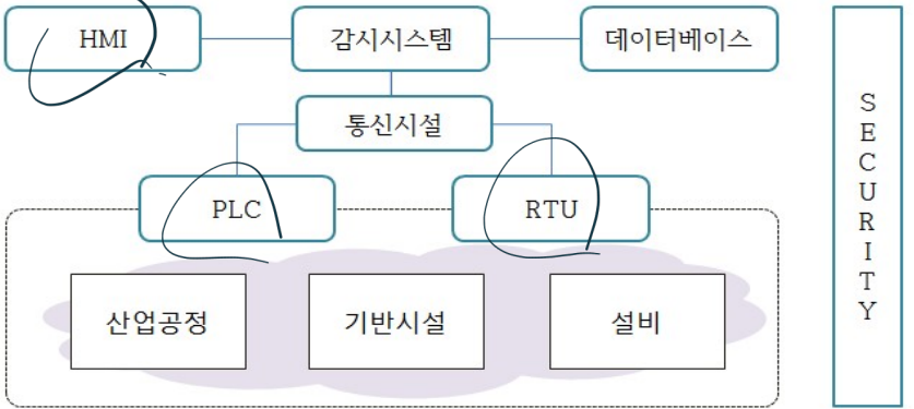 1. 정의 산업제어시스템(산업공정/기반시설/설비)의 작업공정을 RTU(Remote Terminal Unit)를 통해 수집하여 감시하고 제어하는 종합관제시스템 [표준] IEEE Std c37.1-1987 [특징] 거리상 원격에 위치해 제어, 감시 수행, RTU 통한 상태정보 주기적 감시, EMS에서 많이 사용, DCS비해 제어 처리 낮으나, 자료 수집/이벤트 처리 좋음 지능형(차세대) SCADA : AI, 클라우드 등과 결합하여 레이어별 유연성 확보 2. 구성도 및 구성요소 가. 구성도 나. 구성요소 - H감데통 피알보 DE HMI 감시시스템 데이터베이스 통신:경량프로토콜(IEC61850,DNP3),TCP/IP확장지원 PLC:Programmable Logic Controller,현장배치 다목적 기기 RTU..